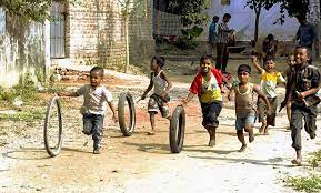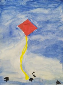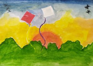 মাঝ আকাশে একটা সাদা ঘুড়ি বেগুনি লেজ আর একটা লাল ঘুড়ি হলুদ লেজ সুতার প্যাচে আঁটকে কাট্টি খেলায় মেতে উঠলো।
