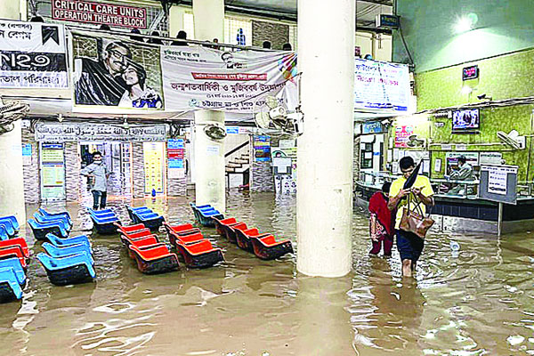 টানা দুইদিনের মাঝারি থেকে ভারি বর্ষণে চট্টগ্রামের নিচু এলাকাগুলোতে পানি জমে জলাবদ্ধতার সৃষ্টি হয়েছে। এদিকে বৃষ্টি ও জোয়ারের পানিতে আবারও ডুবেছে চট্টগ্রাম মা ও শিশু হাসপাতাল। গতকাল রোববার দুপুরের দিকে এবং আগের দিন শনিবার দুপুরের পর থেকে কয়েক দফা বৃষ্টি ও জোয়ারের পানিতে হাসপাতালের নিচতলা ডুবে যায়। বৃষ্টি ছাড়াও শুষ্ক মৌসুমে জোয়ারের পানিতে হাসপাতালের নিচতলা হাঁটু পানিতে তলিয়ে যায়। এ নিয়ে নানা আলোচনা হলেও এই দুর্ভোগ থেকে পরিত্রান পাওয়া যাচ্ছে না। সংশ্লিষ্টরা বলছেন, জলবদ্ধতা নিরসণে গৃহিত মেগাপ্রকল্পের শতভাগ বাস্তবায়ন হলে এই ভোগান্তি থেকে মুক্ত হওয়া যাবে। হাসপাতালের অনুসন্ধান বিভাগের গিয়াস উদ্দিন বলেন, দুপুরের পর থেকে হাসপাতালের নিচতলায় পানি জমতে শুরু করে। সন্ধ্যা গড়াতেই নিচতলা ডুবে যায়। এতে নিচতলায় থাকা জরুরি বিভাগ তৃতীয় তলায় এবং সাধারণ শিশু ওয়ার্ড থেকে কিছু রোগীকে চতুর্থ তলায় জেনারেল ওয়ার্ডে পাঠানো হয়েছে।’ চট্টগ্রাম মা ও শিশু হাসপাতালের পরিচালক নুরুল হক বলেন, জোয়ার ও বৃষ্টির কারণে হাসপাতালের নিচে জলাবদ্ধতার বিষয়টি দীর্ঘদিনের পুরানো। শনিবার ও রোববারও বৃষ্টি ও জোয়ারের কারণে হাসপাতালের নিচতলায় কিছু পানি জমা হয়। তবে এতে স্বাস্থ্য সেবার কোনো সমস্যা হয়নি। তাছাড়া জলাবদ্ধতা পুরো চট্টগ্রামের সমস্যা, শুধু মা ও শিশু হাসপাতালের নয়। জলাবদ্ধতা নিরসণে বাস্তবায়নাধীন মেগাপ্রকল্পের কাজ শেষ হলে আশা করি এই সমস্যা থেকে পরিত্রান পাওয়া যাবে। এই প্রকল্পের সংশ্লিষ্টরাও একই কথা বলেছেন। টানা দুইদিনের বৃষ্টিতে রোববার সকাল থেকে বাকলিয়া, সিডিএ, হালিশহর, আগ্রাবাদ, চান্দগাঁওসহ নিচু এলাকাগুলোতে পানি জমতে শুরু করে। এতে ওই এলাকার বাসিন্দাদের ভোগান্তিতে পড়তে হয়েছে। এখন নগরের বিভিন্ন খাল ভরাট ও জীবিত খালগুলোতে বাঁধ থাকায় মাঝারি বৃষ্টিপাতেও কিছু কিছু জায়গায় জলাবদ্ধতার সৃষ্টি হয় বলে মন্তব্য করেছেন সংশ্লিষ্টরা। এদিকে, বৃষ্টির মধ্যেও লকডাউনে মাঠে ছিল ভ্রাম্যমাণ আদালত। কারণ ছাড়াই যারা ঘর থেকে বেরিয়েছেন তাদের পড়তে হয়েছে জবাবদিহিতার মুখে, গুনতে হয়েছে জরিমানা। তবে ব্যাংক খোলা থাকায় বৃষ্টির মধ্যে অফিসগামীদের পড়তে হয়েছে দুর্ভোগে। চান্দগাঁও আবাসিকের সমশেরপাড়া এলাকার হুমাইরা তালুকদার বলেন, ‘এখানে একটি খাল রয়েছে। এই খালে সিডিএ’র মেগা প্রকল্পের বাঁঁ থাকায় বৃষ্টি হলেই এই এলাকায় পানি জমে যায়।’ আগ্রাবাদ এলাকার বাসিন্দা সিরাজুল ইসলাম বলেন, একে তো বৃষ্টি অন্যদিকে পূর্ণিমার জোয়ারের পানিতে এলাকায় জলাবদ্ধতার সৃষ্টি হয়েছে। এটি এই এলাকার পুরানো সমস্যা। আবহাওয়া অফিসের প্রধান আবহাওয়াবিদ ড. শহিদুল 