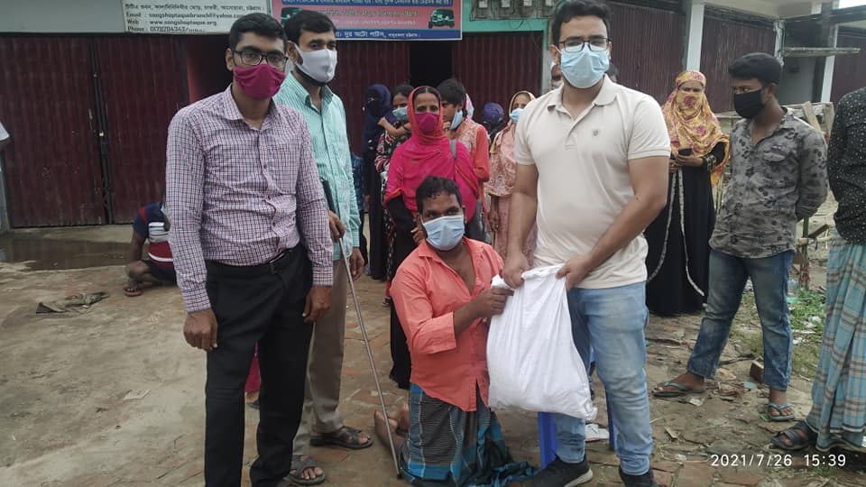গতকাল ২৬/০৭/২১ইং তারিখ একেখান সিআরপি চট্টগ্রাম এর সহযোগীতায় বেসরকারি উন্নয়ন সংস্থা সংশপ্তক এর SESDCB ও PHRPBD প্রকল্প এর অধীনে আনোয়ারা উপজেলার কভিড ১৯ ২য় ধাপে অসহায় তৃনমূল প্রতিবন্ধী ব্যক্তি মোট ৫০ টি পরিবারের মাঝে ত্রান বিতরন করা হয়। এসময় প্রত্যেকটি পরিবার কে চাল ৫ কেজি, আলু ২ কেজি, সোয়াবিন তেল ১ লিটার, ডাল ১ কেজি (মোট ৯ কেজির প্যকেজ/পরিবার) বিতরন করা হয়।