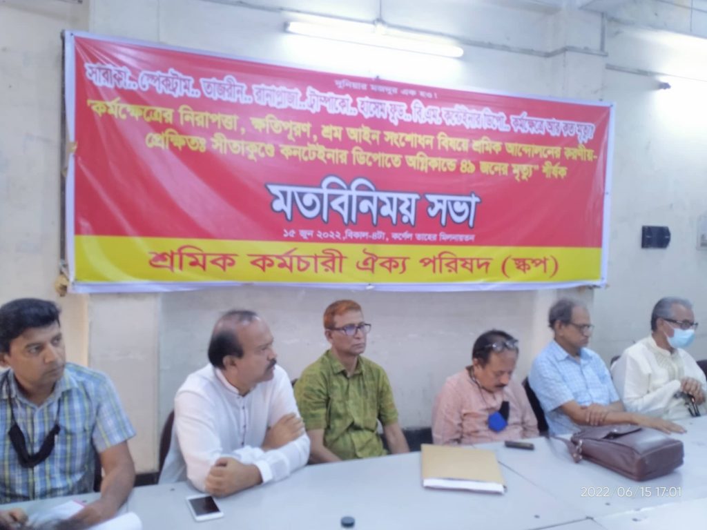 সীতাকুন্ডে বি.এম. কন্টেইনার ডিপোয় অগ্নিকান্ড ও বিস্ফোরণে কমপক্ষে ৪৯ শ্রমিক-কর্মচারী-উদ্ধারকর্মী নিহত হওয়া এবং কয়েকশত মানুষ মারাত্মক আহত হওয়ার মধ্যে দিয়ে প্রতিষ্ঠানের মালিক এবং কর্মক্ষেত্র সংশ্লিষ্ট সরকারী কর্মকর্তাদের দায়িত্বহীনতা এবং পরবর্তীতে দায়িদের গ্রেপ্তার না করে বাঁচানোর প্রচেষ্টার মধ্যে দিয়ে শ্রমজীবীদের বিচার পাওয়ার অধিকারহীনতার যে দৃষ্টান্ত অব্যাহত রাখা হচ্ছে তার প্রতিবাদে এবং কর্মক্ষেত্রের নিরাপত্তা, ক্ষতিপুরণ ও শ্রম আইন সংশোধনে শ্রমিকদের দাবি মানাতে ঐক্যবদ্ধ আন্দোলন গড়ে তোলার লক্ষ্যে আজ ১৫ জুন, বিকাল ৪টায়, শহীদ কর্ণেল তাহের মিলনায়তনে শ্রমিক কর্মচারী ঐক্য পরিষদ (স্কপ) এর আহবানে দেশে ক্রিয়াশীল শ্রমিক ফেডারেশনের নেতৃবৃন্দের মতবিনিময় সভা অনুষ্ঠিত হয়।