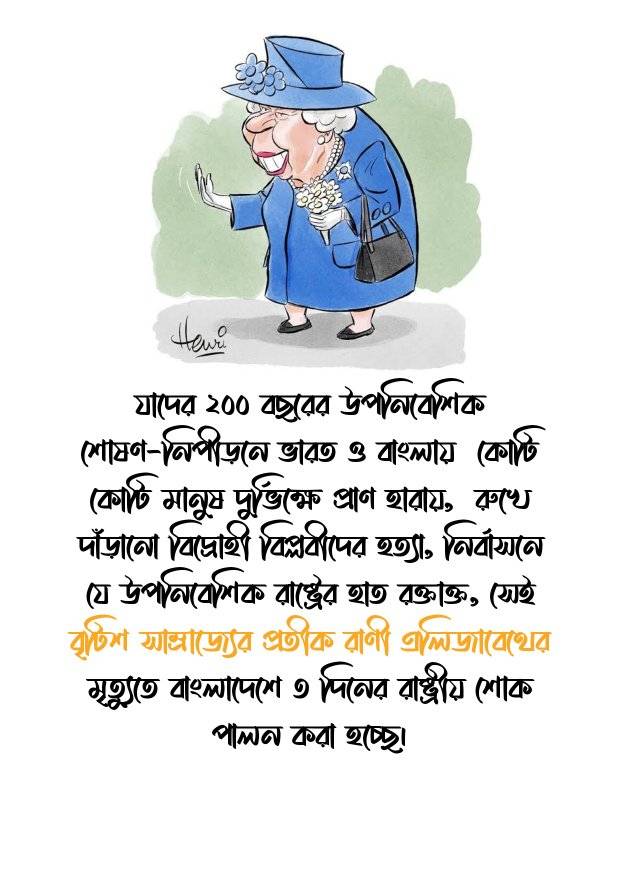 ব্রিটিশ উপনিবেশিক শোষণ – নিপীড়নে ভারত বর্ষে কোটি-কোটি মানুষ দুর্ভিক্ষে প্রাণ হারায়। শাসন-নিপীড়ণের প্রতিবাদ করতে যেয়ে হাজার হাজার মানুষকে খুন হতে হয়েছে ব্রিটিশ উপনিবেশিক শোষকদের হাতে। এই অঞ্চলের মানুষদের হত্যা খুন ও সম্পদ লুন্টনে যে উপনিবেশিক দেশ র হাত রক্তাক্ত সেই ব্রিটিশ সাম্রাজ্যের প্রতীক রানী এলিজাবেথের মৃত্যুতে তিন দিন রাষ্ট্রীয় শোকের কেন দরকার হয়ে পড়লো তা বোঝা সাধারণের পক্ষে কঠিন। রানি কখনোই বাংলাদেশের দেশের নাগরিকদের জন্য অনুপ্রেরণা, সাহস এবং শক্তির একটি দুর্দান্ত উৎস ছিলেন না এবং কখনোই এমন হবার সম্ভবনা নেই।