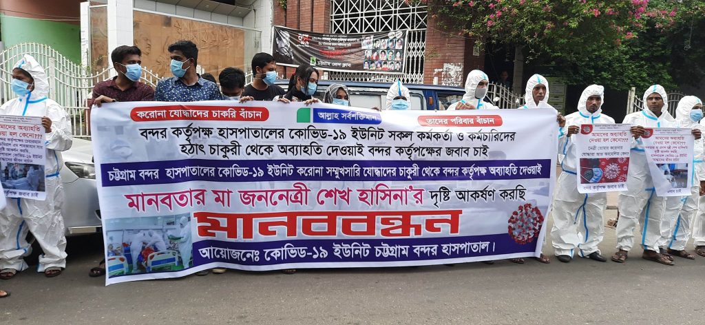 আজ মঙ্গলবার (২৭ সেপ্টেম্বর) চট্টগ্রাম প্রেসক্লাবের সামনে উক্ত ঘটনার প্রতিবাদে মানববন্ধন করেন চাকুরিচ্যুত ডাক্তার-নার্সরা। তারা বলেন জাতির এক দুর্যোগকালে মৃত্যু ভয়কে তুচ্ছ করে করোনা রোগীদের সেবা দেয়ার উদ্দেশ্যে তারা চাকুরিতে যোগদান করেছিলেন। তার প্রতিদান যে এভাবে দেয়া হবে তারা কল্পনাও করতে পারেন নি। তারা মানবিক বিষয় বিবেচনা করে তাদের চাকুরী পূনর্বহাল করার দাবি জানান।