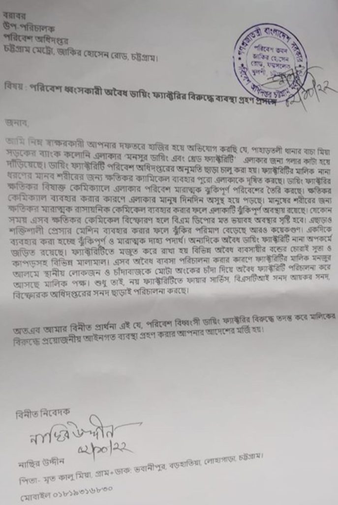 নগরীর পাহাড়তলী এলাকায় ইফ্লুয়েন্ট ট্রিটমেন্ট প্লান্ট-ইটিপি ছাড়া ও অনুমোদনহীন ডাইং ফ্যাক্টরি স্থাপন করায় বন্ধের নির্দেশ দিয়েছেন পরিবেশ অধিদপ্তর। রোববার (২৩ অক্টোবর) সকালে শুনানি শেষে ‘মনসুর ডায়িং এবং থ্রেড’ ফ্যাক্টরিটি বন্ধ রাখার নির্দেশ দেন চট্টগ্রাম পরিবেশ অধিপ্তরের সহকারী পরিচালক হাছান আহম্মদ। পরিবেশ অধিদপ্তর সূত্র জানায়, গত ২ অক্টোবর পাহাড়তলী এলাকার বাসিন্দা নাসির উদ্দিন পরিবেশ অধিদপ্তরে লিখিতভাবে অভিযোগ করেন। এ অভিযোগের প্রেক্ষিতে গত ১৬ অক্টোবর পরিবেশ অধিদপ্তরের সহকারী পরিচালক হাছান আহম্মদের নেতৃত্বে একটি টিম ঘটনাস্থল পরিদর্শন করেন। ২৩ অক্টোবর ফ্যাক্টরিটির মালিক মনজুর আলমকে পরিবেশ অধিদপ্তরে শুনানীতে উপস্থিত থাকার জন্য নির্দেশনা দেয়া হয়। শুনানি শেষে ডাইং ফ্যাক্টরি বন্ধ রাখার নির্দেশ দেয়া হয়। এছাড়া সব ধরণের কার্যক্রম বন্ধ রেখে অন্যত্রে সরিয়ে নেয়ার নির্দেশনা দেয়া হয়। ডাইং ফ্যাক্টরিটিতে নানা ধরণের কেমিক্যাল ও বয়লার রাখার অনুমোদন না থাকায় বন্ধ রাখার নির্দেশনা দেয়া হয়। পরিবেশ অধিদপ্তরে দেয়া অভিযোগে বলা হয়- পাহাড়তলী থানার বাচা মিয়া সড়কের ব্যাংক কলোনি এলাকার ‘মনসুর ডায়িং এবং থ্রেড ফ্যাক্টরি’টি পরিবেশ অধিদপ্তরের অনুমতি ছাড়া চালু করা হয়। ফ্যাক্টরিটির মালিক মানব শরীরের জন্য ক্ষতিকর নানা ধরণের কেমিক্যাল ব্যবহার পুরো এলাকাকে দূষিত করছে। ডায়িং ফ্যাক্টরির ক্ষতিকর বিষাক্ত কেমিক্যালে এলাকার পরিবেশ মারাত্মক ঝুঁকিপূর্ণ পরিবেশের তৈরি করছে। ক্ষতিকর কেমিক্যাল ব্যবহার করার কারণে এলাকার মানুষ দিনদিন অসুস্থ হয়ে পড়ছে। # ২৪.১০.২০২২ চট্টগ্রাম #