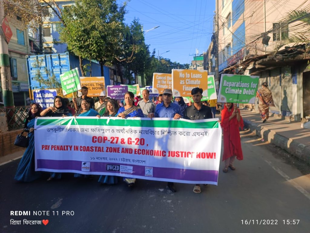 সংশপ্তক, বাংলাদেশের বৈদেশিক দেনা বিষয়ক কর্মজোটের (বিডাব্লিউজিইডি), এবং ঋণ ও উন্নয়ন বিষয়ক এশীয় জন-আন্দোলনের (এপিএমডিডি) যৌথ উদ্যোগে এ র্যালী অনুষ্ঠিত হয়। মানববন্ধনে চট্টগ্রামের রাজনৈতিক ও সাংস্কৃতিক নেতৃবৃন্দ, জলবায়ু-কর্মী অংশগ্রহণ করেন।