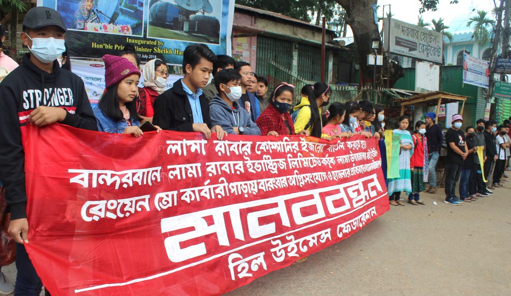 লামায় ৭ টি ম্রো বাড়িতে অগ্নিসংযোগ, হামলা এবং লুটপাতকারী লামা রাবার কোম্পানির শাস্তির দাবিতে মানববন্ধন