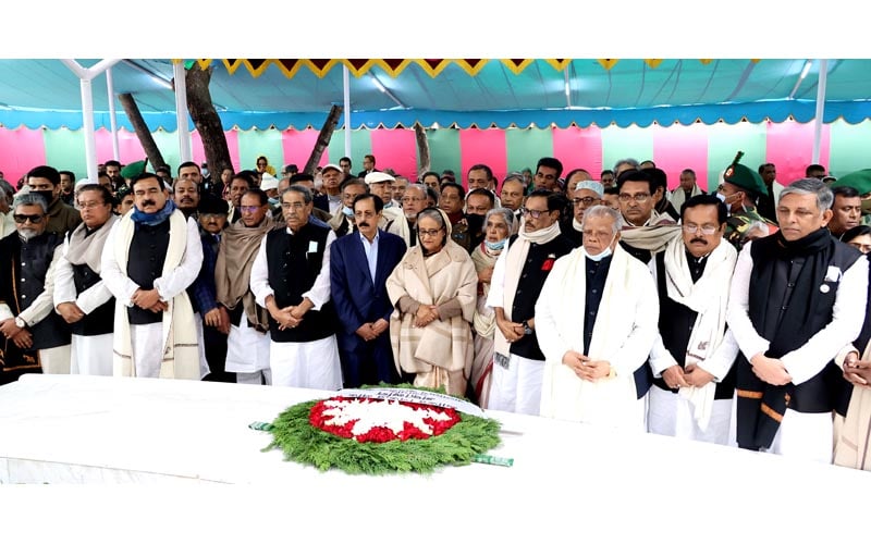 আওয়ামী লীগ সভাপতি শেখ হাসিনা নেতৃবৃন্দকে সাথে নিয়ে টুঙ্গিপাড়ায় জাতির পিতা বঙ্গবন্ধু শেখ মুজিবুর রহমানের সমাধিতে পুষ্পস্তবক অর্পণ করে এই শ্রদ্ধা জানান।