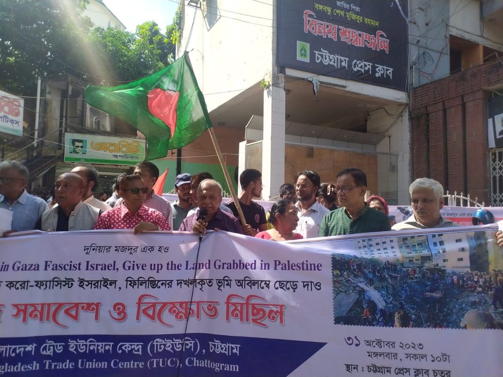গাজায় বর্বর ইসরাইলীদের দ্বারা নির্বিচারে ফিলিস্তিনিদের হত্যার বিরুদ্ধে বাংলাদেশ ট্রেড ইউনিয়ন কেন্দ্র চট্টগ্রাম জেলা কমিটির উদ্যোগে এক প্রতিবাদ সমাবেশ ও বিক্ষোভ মিছিল অদ্য সকাল ১০টায় চট্টগ্রাম প্রেসক্লাব প্রাঙ্গণে অনুষ্ঠিত হয়। টিইউসি চট্টগ্রাম জেলা কমিটির সভাপতি বীরমুক্তিযোদ্ধা তপন দত্তের সভাপতিত্বে এবং যুগ্ম সম্পাদক ইফতেখার কামাল খানের সঞ্চালনায় অনুষ্ঠিত উক্ত সমাবেশে প্রধানবক্তা হিসাবে উপস্থিত ছিলেন চট্টগ্রাম পেশাজীবী সমন্বয় পরিষদের আহ্বায়ক ও চর্মরোগ বিশেষজ্ঞ ডাক্তার এ কিউ এম সিরাজুল ইসলাম এবং অন্যান্যের মধ্যে বক্তব্য রাখেন নারী নেত্রী ও মানবাধিকার কর্মী নূর জাহাজ খান, চট্টগ্রাম মহানগর মুক্তিযোদ্ধা কমান্ডার মোজাফফর আহাম্মদ, সিনিয়র সাংবাদিক জসিম চৌধুরী সবুজ, চট্টগ্রাম প্রেস ক্লাবের সাবেক সাধারণ সম্পাদক চৌধুরী ফরিদ, গণতান্ত্রিক আইনজীবী সমিতির সাধারণ সম্পাদক জহির উদ্দিন মাহমুদ, টিইউসির কেন্দ্রীয় সংগঠক ফজলুল কবির মিন্টু, ট্রেড ইউনিয়ন আঞ্চলিক কমিটির নেতা মহিন উদ্দিন ও সুকান্ত দত্ত, চট্টগ্রাম বেসরকারী স্বাস্থ্য প্রতিষ্ঠান কর্মচারী ইউনিয়নের সভাপতি আব্দুর রহিম, ইমারত নির্মান শ্রমিক ইউনিয়ন বাংলাদেশের চট্টগ্রাম মহানগরনেতা আব্দুল হানিফ, চট্টগ্রাম জেলা ও মহানগর কমিটির সাধারণ সম্পাদক মোঃ পারভেজ, হোটেল এন্ড রেস্টুরেন্ট শ্রমিক ইউনিয়ন চট্টগ্রাম জেলা কমিটির সভাপতি মোহাম্মদ হানিফ, হোটেল সেন্ট মার্টিন কর্মচারী ইউনিয়ন (সিবিএ) এর সভাপতি মিজানুর রহমান প্রমুখ শ্রমিকনেতা ।