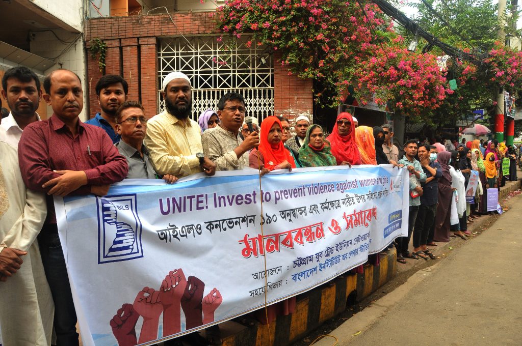 বিশ্ব নারী নির্যাতন প্রতিরোধ পক্ষের কর্মসূচীর অ়ংশ হিসাবে আইএলও কনভেনশন ১৯০ অনুস্বাক্ষর এবং নারীর উপর সকল প্রকার সহি়ংসতা বন্ধের দাবিতে চট্টগ্রাম যুব ট্রেড ইউনিয়ন নেটওয়ার্ক কর্তৃক চট্টগ্রাম প্রেস ক্লাব চত্বরে এক মানববন্ধন ও সমাবেশ অনুষ্ঠিত হয়। চট্টগ্রাম যুব ট্রেড ইউনিয়ন ট্রেড ইউনিয়ন নেটওয়ার্কের অন্যতম সংগঠক বাংলাদেশ জাতীয়তাবাদী শ্রমিক দলের চট্টগ্রাম বিভাগীয় সহসভাপতি শাহনেওয়াজ চৌধুরীর সভাপতিত্বে এবং বাংলাদেশ ট্রেড ইউনিয়ন কেন্দ্র কেন্দ্রীয় কমিটির সংগঠক ও বিলস কর্মকর্তা ফজলুল কবির মিন্টুর সঞ্চালনায় অনুষ্ঠিত উক্ত সমাবেশে অন্যান্যের মধ্যে বক্তব্য রাখেন বিলস কর্মকর্তা পাহাড়ি ভট্টচার্য, রিজওয়ানুর রহমান খান, শ্রমিক দলের চট্টগ্রাম বিভাগীয় শিক্ষা ও গবেষনা সম্পাদক এডভোকেট ইকবাল হোসেন, বাংলাদেশ জাতীয় শ্রমিক ফেডারেশনের জাহেদ উদ্দিন শাহিন, জাতীয় শ্রমিক লীগের মোঃ জাবেদ, বাংলাদেশ ট্রেড ইউনিয়ন কেন্দ্রের বায়েজিদ-পাঁচলাইশ আঞ্চলিক কমিটির সাধারন সম্পাদক মহিন উদ্দিন,বাংলাদেশ লেবার ফেডারেশনের নেতা মোঃ আলমগীর হোসেন এবং বিএলএফ মহিলা কমিটির সভাপতি গুলজার বেগম বেসরকারী স্বাস্থ্য প্রতিষ্ঠান কর্মচারী ইউনিয়নের নেত্রী আদুরী কনা, বাংলাদেশ মুক্ত শ্রমিক ফেডারেশনের নাজমা আক্তার, বিএফটিউসির রেখা বড়ুয়া, জাতীয় শ্রমিক জোটের নেত্রী জ্যোৎস্না আক্তার প্রমুখ যুব ট্রেড ইউনিয়ন নেতৃবৃন্দ।