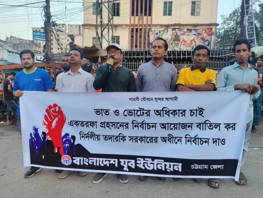 ভাত ও ভোটের অধিকার প্রতিষ্ঠা এবং নির্দলীয় তদারকি সরকারের অধীনে নির্বাচনের দাবিতে যুব ইউনিয়ন, চট্টগ্রাম জেলার বিক্ষোভ অনুষ্ঠিত।