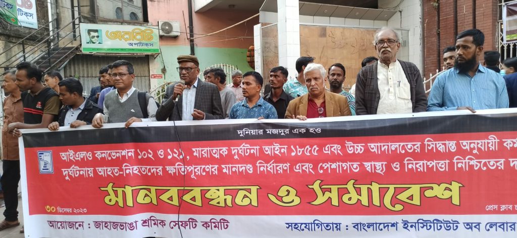 জাহাজভাঙা শ্রমিক সেফটি কমিটির উদ্যোগে গতকাল ৩০ ডিসেম্বর শনিবার বিকাল ৩টায় আন্তর্জাতিক শ্রমমান তথা আইএলও কনভেনশন ১০২ ও ১২১, মারাত্মক দুর্ঘটনা আইন ১৮৫৫ এবং উচ্চ আদালতের নির্দেশনা অনুসারে কর্মক্ষেত্রে দুর্ঘটনায় নিহত-আহতের ক্ষতিপূরনের মানদন্ড নির্ধারন এবং পেশাগত স্বাস্থ্য নিরাপত্তা নিশ্চিতকরনের দাবিতে চট্টগ্রামের জামাল খানস্থ প্রেস ক্লাব চত্বরে এক মানববন্ধন ও সমাবেশ অনুষ্ঠিত হয়েছে। জাহাজভাঙা শ্রমিক সেফটি কমিটির আহ্বায়ক এডভোকেট জহির উদ্দিন মাহমুদের সভাপতিত্বে অনুষ্ঠিত উক্ত সমাবেশ যৌথভাবে সঞ্চালনা করেন বিল-ডিটিডিএ সেন্টার কো-অর্ডিনেটর ফজলুল কবির মিন্টু এবং সেফটি কমিটির যুগ্ম সদস্য সচিব মোঃ ইদ্রিছ।