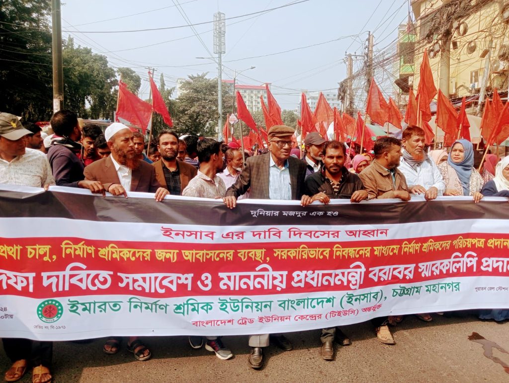 ইমারত নির্মান শ্রমিক ইউনিয়ন-ইনসাব চট্টগ্রাম জেলার উদ্যোগে দাবি দিবস উপলক্ষে পুরাতন রেলস্টেশন চত্বরে এক সমাবেশ অনুষ্ঠিত হয়। ইনসাব চট্টগ্রাম জেলার আহ্বায়ক মোঃ আব্দুর শুক্কুরের সভাপতিত্বে এবং বায়েজিদ থানা কমিটির সাধারণ সম্পাদক মহিন উদ্দিনের সঞ্চালনায় অনুষ্ঠিত উক্ত সমাবেশে প্রধান অতিথি হিসাবে উপস্থিত ছিলেন বাংলাদেশ ট্রেড ইউনিয়ন কেন্দ্র চট্টগ্রাম জেলা কমিটিরসভাপতি বীর মুক্তিযোদ্ধা তপন দত্ত এবং অন্যান্যের মধ্যে বক্তব্য রাখেন বাংলাদেশ ট্রেড ইউনিয়ন কেন্দ্র চট্টগ্রাম জেলার যুগ্ম সম্পাদক ইফতেখার কামাল খান, ইনসাব সদরঘাট থানা কমিটির সাধারণ সম্পাদক মোঃ আব্বাস, পাঁচলাইশ থানা কমিটির সাধারণ সম্পাদক মোঃ দেলোয়ার হোসেন, বায়েজিদ থানা কমিটির নেতা আ: হালিম, শাহনাজ বেগম,