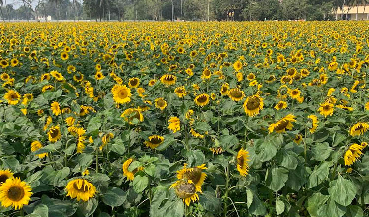 ভোজ্য তেলের সংকট কাটাতে মেহেরপুরে বীজের জন্য সূর্যমুখি চাষ হয়েছে। যা থেকে অন্তত এক হাজার হেক্টর জমিতে চাষের জন্য বীজ উৎপাদন হবে। যার আনুমানিক দাম এক কোটি টাকা। সারাদেশে ছড়িয়ে দিতে চতুর্থবারের মতো বীজের জন্য সূর্যমুখির চাষ করেছে মেহেরপুরের আমঝুপি বীজ উৎপাদন খামার। সেখানে বীজ উৎপাদনে ২১ বিঘা জমিতে চাষ হয়েছে সূর্যমুখির। ফুলে ফুলে ভরে গেছে খামারের জমি। সেখানে প্রতিদিন কমকরে হলেও দুই থেকে আড়ায় হাজার নারী পুরুষ ভিড় করছে ফুলের বাগানে ছবি তুলতে। ওই বাগানে ঝড় বয়ে যাচ্ছে সেলফি তোলার। বিভিন্ন বয়সের নারী পুরুষ টিকটকে ব্যস্ত। মেহেরপুর, চুয়াডঙ্গাসহ আশপাশের জেলার মানুষ ছুটে আসছে সূর্যমুখির ফুলের বাগানে। আসছে অগণিত প্রেমিক প্রেমিকারা। সরকারি কর্মকর্তারাও পরিবার-পরিজন নিয়ে সেখানে ছুটে যাচ্ছেন। সকলেরই উদ্দেশ্য ফুলের বাগানে নিজেকে ধরে রাখতে ছবি তুলতে। কেউ যেন ফুল না ছেড়ে সেজন্য সেখানে অতিরিক্ত লোকবলও নিয়োগ করতে হয়েছে খামার কর্তৃপক্ষকে। এখন বীজ খামারে তুলতে পারবে কিনা এ নিয়ে শঙ্কিত খামারের কর্মকর্তারা। কারণ ফুলেই পাওয়া যায় বীজ। আর সেই দৃষ্টিকাড়া ফুলের মধ্যে কেউবা সেলফি, কেউবা স্বজন নিয়ে ছবি তুলতে ভিড় করছে সব বয়সের নারী পুরুষ।