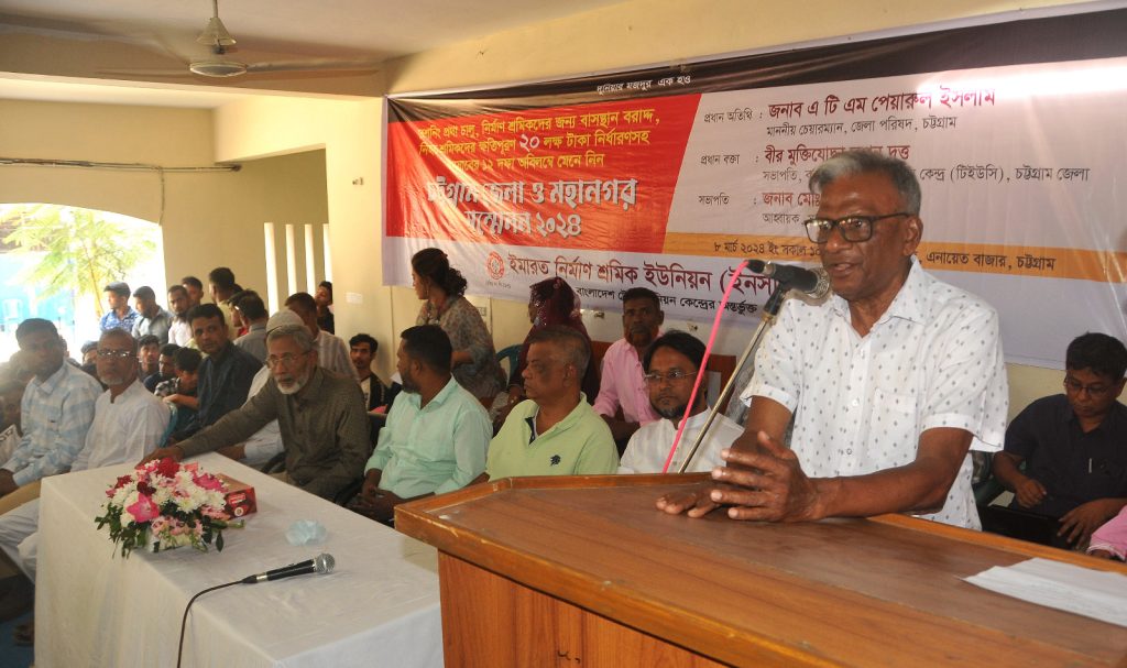 প্রধান বক্তা তপন দত্ত বলেন, স্বাধীনতার পর বিগত পাচ দশকে নির্মান খাতের ব্যাপক প্রসার ঘটেছে, সমগ্র বাংলাদেশে পাকা ইমারত, সড়ক, রাস্তাঘাট ইত্যাদি কাজ বিস্তৃত হয়েছে। এই খাতে দেশ বিদেশে এখন প্রায় ৪০/৪৫ লক্ষ শ্রমিক কর্মরত। দেশের অভ্যন্তরে এই খাতের শ্রমিকদের শ্রমে ঘামে পদ্মা সেতু, কর্নফুলি নদীর তল দিয়ে টানেল ইত্যাদি কঠিন এবং শ্রম সাধ্য কাজ করতে সক্ষম হলেও নির্মান শ্রমিকদের স্থায়ী কাজের ব্যবস্থা নেই। দেশে বহু বড় বড় ডেভেলপার কোম্পানী প্রতিষ্ঠিত হলেও তাদের কোন স্থায়ী শ্রমিক নেই। ফলে নির্মান শ্রমিকেরা প্রাতিষ্ঠানিক শ্রমিক হিসাবে শ্রম আইন অনুযায়ী যে সকল সুযোগ সুবিধা পাওয়ার কথা তা থেকে প্রতি নিয়ত বঞ্চিত হচ্ছে। নির্মান শ্রমিকেরা সবেতন ছুটি, চিকিৎসা সুবিধা, পেনশন, গ্র্যাচুইটি ইত্যাদি সুবিধা থেকে বঞ্চিত হচ্ছে।