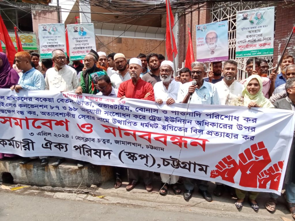 ঈদের আগে সকল শ্রমিকদের মার্চ মাসের পূর্ণ বেতন এবং পবিত্র ঈদুল ফিতর উপলক্ষে বোনাস প্রদানের দাবিতে চট্টগ্রাম প্রেস ক্লাব চত্বরে চট্টগ্রাম শ্রমিক কর্মচারী ঐক্য পরিষদের উদ্যোগে এক মানববন্ধন ও সমাবেশ অনুষ্ঠিত হয়। জাতীয় শ্রমিক লীগ কেন্দ্রীয় কমিটির সহ সভাপতি মু∙ শফর আলীর সভাপতিত্বে এবং ট্রেড ইউনিয়ন সংঘের চট্টগ্রাম জেলার আহ্বায়ক মোঃ খোরশেদুল আলমের সঞ্চালনায় বক্তব্য রাখেন টিইউসি চট্টগ্রাম জেলার সভাপতি এবং চট্টগ্রাম স্কপের আহ্বায়ক তপন দত্ত, জাতীয়তাবাদী শ্রমিক দলের চট্টগ্রাম বিভাগীয় সভাপতি এ এম নাজিম উদ্দিন, বাংলাদেশ মুক্ত শ্রমিক ফেডারেশনের চট্টগ্রাম জেলার সভাপতি কাজী আলতাফ হোসেন, টিইউসি কেন্দ্রীয় কমিটির সংগঠক ফজলুল কবির মিন্টু, বাংলাদেশ লেবার ফেডারেশন চট্টগ্রাম মহানগর সভাপতি নুরুল আবছার তৌহিদ, সমাজতান্ত্রিক শ্রমিক ফ্রন্টের নেতা মহিন উদ্দিন, বাংলাদেশ ফ্রী ট্রেড ইউনিয়ন কংগ্রেসের চট্টগ্রাম জেলার সাধারণ সম্পাদক কে এম শহিদুল্লাহ, জাতীয় শ্রমিক লীগের উজ্জ্বল বিশ্বাস, লুৎফুন্নাহার সোনিয়া, জাতীয় শ্রমিক ফেডারেশনের জাহেদ উদ্দিন শাহিন, জাতীয় শ্রমিক জোটের জ্যোছনা আক্তার প্রমুখ নেতৃবৃন্দ।