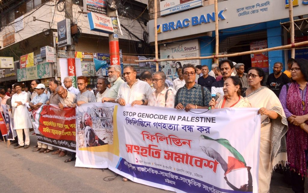চট্টগ্রাম জেলা কমিউনিস্ট পার্টির সভাপতি অশোক সাহা বলেন, ‘সাত দশক ধরে প্যালেস্টাইনের জনগণ যে জাতীয় মুক্তিসংগ্রাম করছে সেটাকে টুটি টিপে হত্যা করার শেষ আয়োজন চলছে গাজায়। এ ইসরাইলি জায়নবাদ আমেরিকার দালালরা দীর্ঘকাল ধরে প্যালেস্টাইনের লাখ লাখ মানুষ খুন করেছে। তারাই চক্রান্ত করে প্যালেস্টাইনের অবিসংবাদিত নেতা ইয়াসির আরাফাতকে খুন করেছে।’