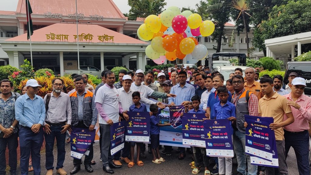 বিশ্ব শিশুশ্রম প্রতিরোধ দিবস ২০২৪ উপলক্ষে চট্টগ্রাম জেলা প্রশাসন এবং শ্রম ও কর্মসংস্থান মন্ত্রণালয়, স্থায়ীত্বশীল উন্নয়নের জন্য সংগঠন ইপসা, সলিডার সুইস ও বিশ্ব শিশুশ্রম প্রতিরোধ দিবস উদযাপন পরিষদ এবং এনজিওদের সমন্বয়ে গতকাল সকাল ১১টায় এক বর্ণাঢ্য র্যালী অনুষ্ঠিত হয়। অনুষ্ঠান উদ্বোধন করেন চট্টগ্রামের অতিরিক্ত জেলা ম্যাজিস্ট্রেট (এডিএম ) জনাব এ কে এম গোলাম মোর্শেদ খান।