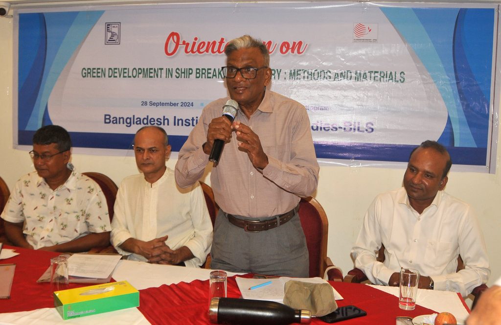 বাংলাদেশ ইনস্টিটিউট অব লেবার স্টাডিজ-বিলস এর উদ্যোগে আজ সকাল ১০টায় স্থানীয় একটি হোটেলের কনফারেন্স রুমে “গ্রিন ডেভেলপমেন্ট ইন শিপ ব্রেকিং ইয়ার্ডঃ প্রসিডিউরস এন্ড মেটারিয়ালস” শীর্ষক এক অরিন্টেশন সভা অনুষ্ঠিত হয় । জাহাজ ভাঙা শ্রমিক ট্রেড ইউনিয়ন ফোরামের সভাপতি শ্রমিকনেতা তপন দত্তের সভাপতিত্বে এবং সদস্য সচিব ফজলুল কবির মিন্টুর সঞ্চালনায় অনুষ্ঠিত উক্ত সভায় বক্তব্য রাখেন ফোরামের যুগ্ম আহ্বায়ক এ এম নাজিম উদ্দিন, জাহাজভাঙা শ্রমিক সেফটি কমিটির আহ্বায়ক এডভোকেট জহির উদ্দিন মাহমুদ, জাতীয়তাবাদী শ্রমিক দলের সাংগঠনিক সম্পাদক শ ম জামাল, জাহাজভাঙা শ্রমিক ট্রেড ইউনিয়ন ফোরামের সদস্য মাহাবুবুল আলম, বাংলাদেশ মুক্ত শ্রমিক ফেডারেশন চট্টগ্রাম জেলার সাধারণ সম্পাদক নুরুল আবসার, বাংলাদেশ মেটাল ওয়ার্কার্স ফেডারেশনের যুগ্ম সম্পাদক মোঃ আলী, জাতীয় শ্রমিক ফেডারেশন চট্টগ্রাম জেলার সাধারণ সম্পাদক দিদারুল আলম চৌধুরী, বাংলাদেশ মুক্ত শ্রমিক ফেডারেশনের যুগ্ম সম্পাদক মোঃ ইদ্রিছ, সেফটি কমিটির সদস্য মাহাবুবুল আলম, বাংলাদেশ ট্রেড ইউনিয়ন কেন্দ্রের সংগঠক জামাল উদ্দিন প্রমুখ।