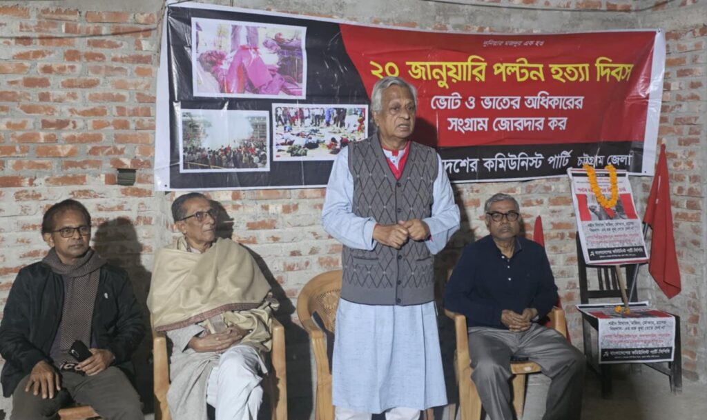 এ উপলক্ষ্যে গতকাল ২০ জানুয়ারী, ২০২৫ সোমবার সন্ধ্যা ৬ টায়, চট্টগ্রামের হাজারীগলিস্থ সিপিবি কার্যালয়ে ২৪ তম পল্টন হত্যার স্বরণ সভায় সভাপ্রতিত্ব করেন সিপিবি চট্টগ্রাম জেলা কমিটি সভাপতি কমরেড অশোক সাহা, সঞ্চালনা করেন জেলা কমিটির সহকারী সম্পাদক কমরেড নূরুচ্ছাফা ভূঁইয়া। উক্ত সভায় বক্তব্য রাখেন সিপিবির কেন্দ্রীয় কমিটি সভাপতি বীর মুক্তিযোদ্ধা কমরেড মোঃ শাহ আলম, সিপিবি কেন্দ্রীয় কমিটির সদস্য কমরেড মৃনাল চৌধুরী, জেলা সম্পাদক মন্ডীর সদস্য বীর মুক্তিযোদ্ধা কমরেড উত্তম চৌধুরী, কমরেড ফরিদুল ইসলাম, কমরেড রেখা চৌধুরী ও ছাত্র নেতা সুদীপ্ত চাকমা প্রমুখ।