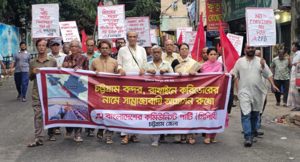 রাখাইনে মানবিক করিডোর দেওয়া এবং চট্টগ্রাম বন্দরের ব্যবস্থাপনা বিদেশি কোম্পানির হাতে তুলে দেওয়ার সিদ্ধান্তের প্রতিবাদে গতকাল শুক্রবার বিকাল ৫ টায় সিপিবি চট্টগ্রাম জেলার উদ্যেগে বিক্ষোভ মিছিল ও সমাবেশ অনুষ্ঠিত হয়।