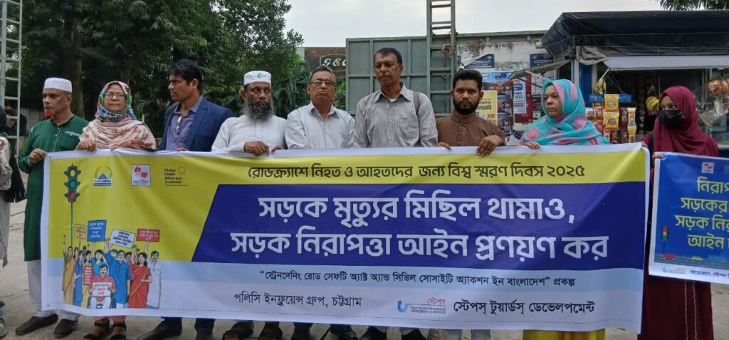 রোড ক্র্যাশে নিহত ও আহতদের স্মরণে বিশ্ব স্মরণ দিবস ২০২৫ উপলক্ষে চট্টগ্রামে এক মানববন্ধন অনুষ্ঠিত হয়েছে। “সড়কে মৃত্যুর মিছিল থামাও, সড়ক নিরাপত্তা আইন প্রণয়নের দাবিতে” এই স্লোগানে মানববন্ধনের আয়োজন করে স্টেপস টুয়ার্ডস ডেভেলপমেন্ট, পলিসি ইনফ্লুয়েন্স গ্রুপ–চট্টগ্রাম এবং ক্যাব চট্টগ্রাম। ২০২৫ সালের ২ ডিসেম্বর বিকেল ৩টা ৪৫ মিনিটে নগরীর জিইসি কনভেনশন হলের সামনে এ মানববন্ধন অনুষ্ঠিত হয়। অনুষ্ঠানে সভাপতিত্ব করেন পলিসি ইনফ্লুয়েন্স গ্রুপ চট্টগ্রামের সভাপতি, বিশিষ্ট কলামিস্ট মুহাম্মদ মুসা খান, এবং সঞ্চালনা করেন আইএসডিই–এর কর্মসূচি কর্মকর্তা রাইসুল ইসলাম। দিবসের ধারণাপত্র পাঠ করেন রাসেল উদ্দীন।