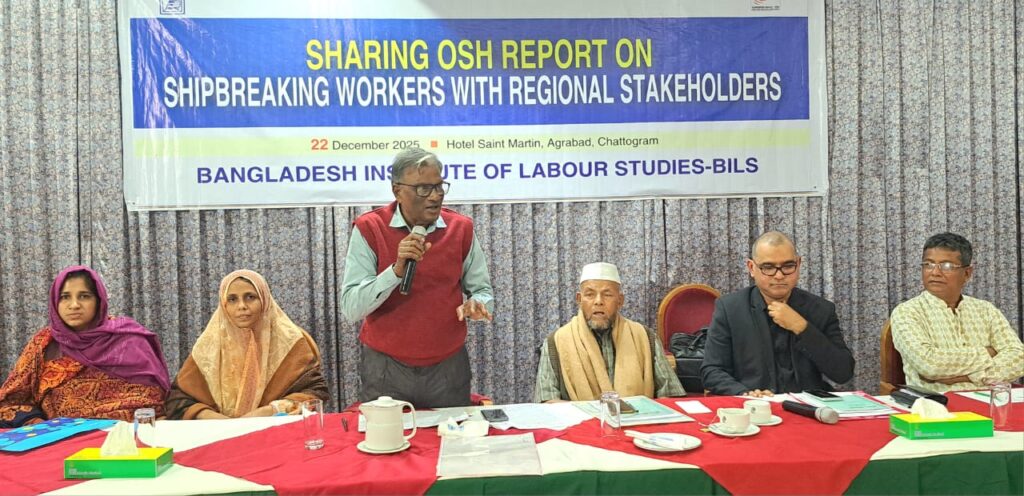 জাহাজভাঙা শিল্পে শ্রমিকদের নিরাপত্তা পরিস্থিতি নিয়ে গভীর উদ্বেগ প্রকাশ করে ২০২৫ সালের শ্রমিক দুর্ঘটনার প্রতিবেদন আজ আঞ্চলিক অংশীজনদের সামনে উপস্থাপন করা হয়েছে। এ উপলক্ষে আজ সকাল ১০টায় চট্টগ্রামের আগ্রাবাদস্থ হোটেল সেন্ট মার্টিনে এক আলোচনা সভা অনুষ্ঠিত হয়।