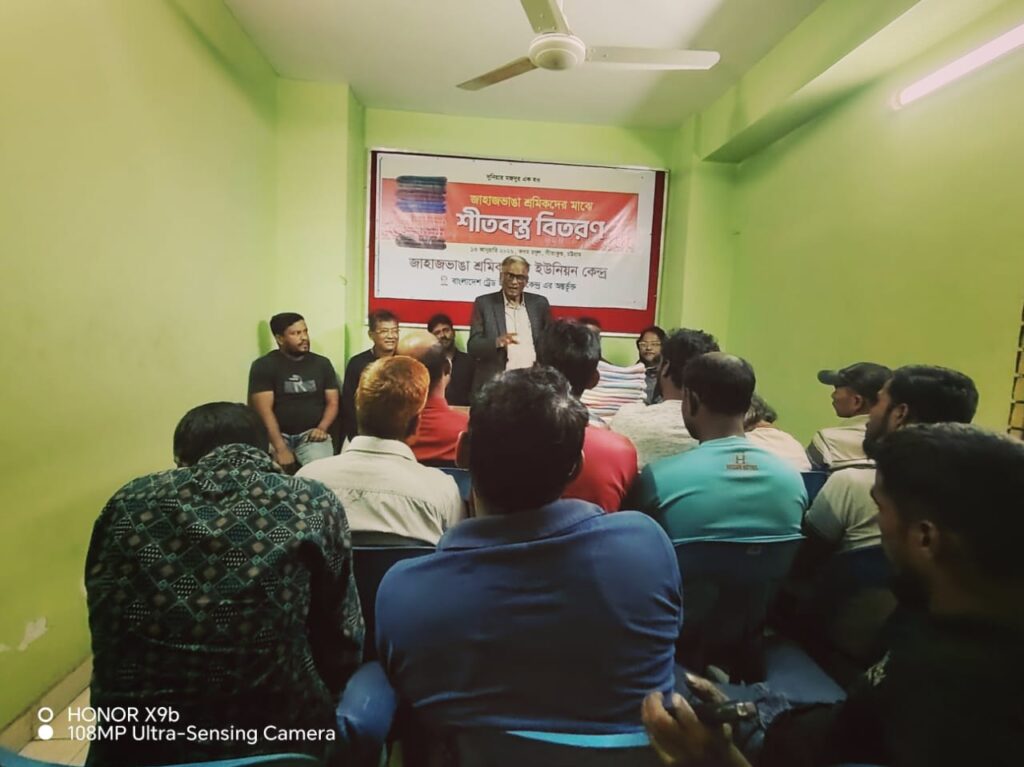 জাহাজভাঙা শ্রমিক ট্রেড ইউনিয়ন কেন্দ্রের উদ্যোগে আজ সকাল ১১টায় জাহাজভাঙা শ্রমিকদের মাঝে কম্বল বিতরণ করা হয়। এ উপলক্ষে আয়োজিত এক আলোচনাসভায় সভাপতিত্ব করেন সংগঠনের সভাপতি মানিক মণ্ডল এবং সঞ্চালনা করেন সাধারণ সম্পাদক জামাল উদ্দিন।